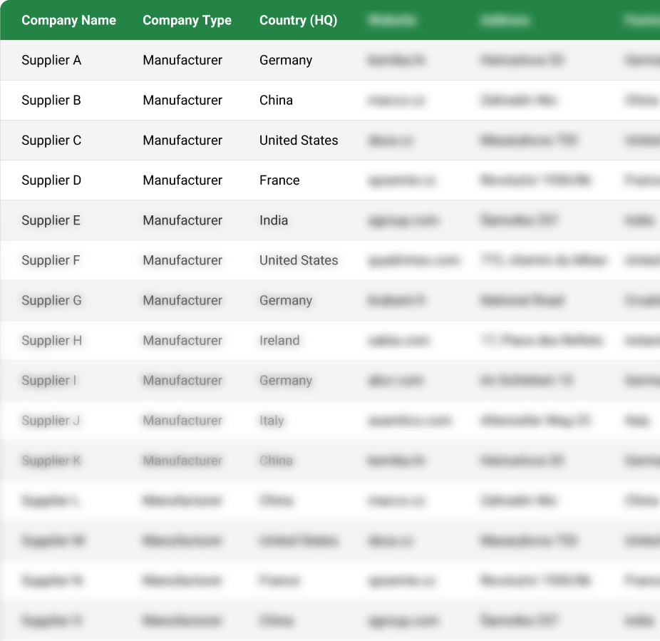We automate the research and qualification steps, giving you accurate, complete supplier shortlists for your category or material.